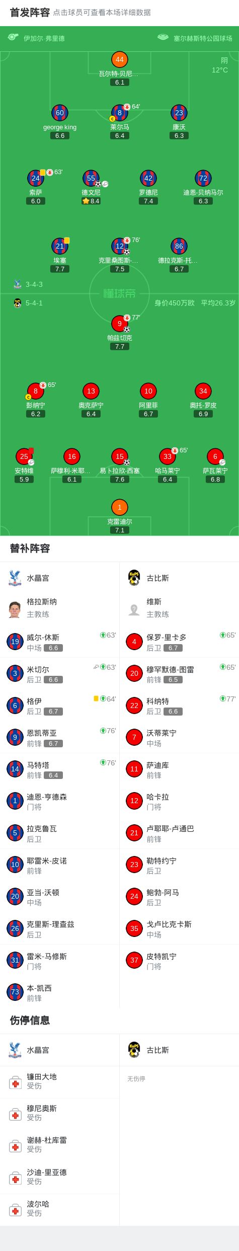 第53分钟,安特维助攻,西塞垫射破门将比分反超,古比斯2-1水晶宫