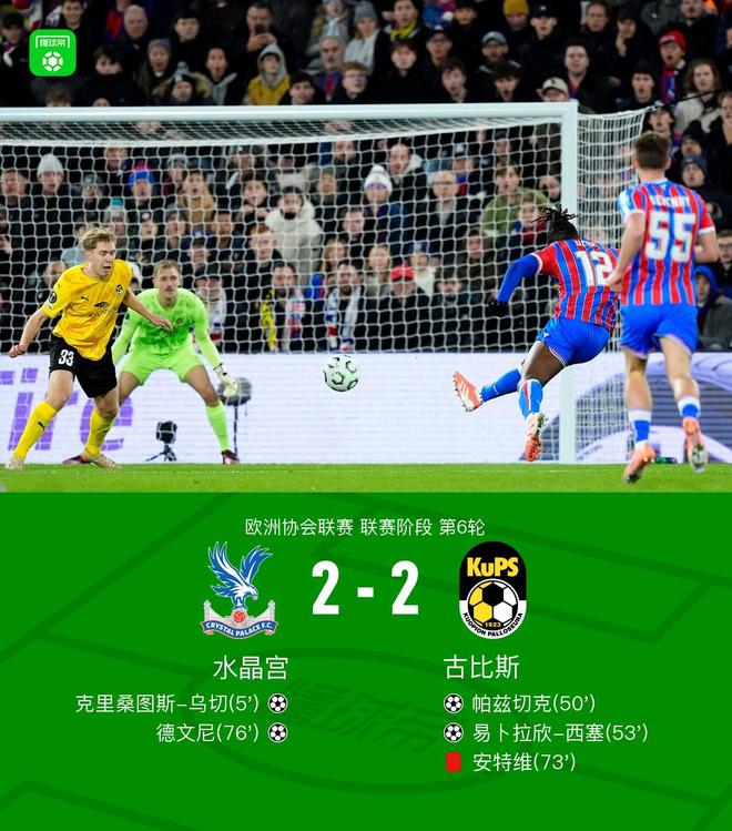 北京时间12月19日,欧洲协会联赛联赛阶段第6轮展开较量,水晶宫与古比斯展开激烈对决。比赛伊始,德文尼送出助攻,克里桑图斯-乌切成功破门,为球队先拔头筹。随后,古比斯由萨瓦莱宁助攻帕兹切克完成进球,将比分扳平。不久后,安特维助攻易卜拉欣-西塞再入一球,古比斯实现反超。比赛进行中,安特维因犯规被红牌罚下,场上局势发生变化。此后,米切尔送出助攻,德文尼抓住机会破门得分,帮助球队最终将比分定格。全场结束,双方以2比2握手言和。